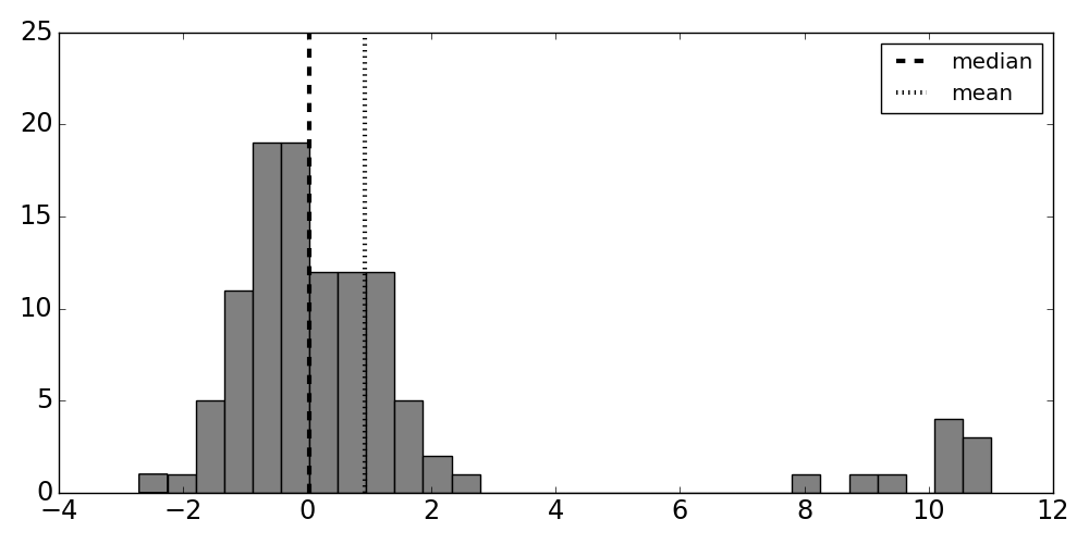 # Histogram of sample data. Notice that the group of infrequent samples on the # right separates the mean and median estimates indicated by the vertical # lines.
