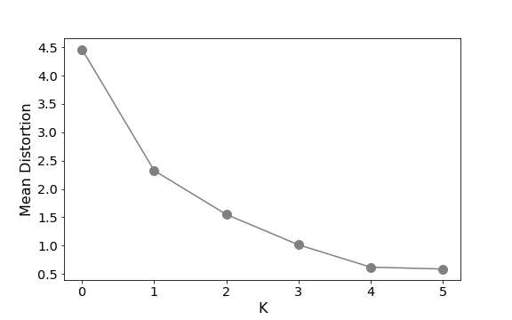where we have chosen $K=4$. How do we choose the value of $K$? This is the eternal question of generalization versus approximation --- too many clusters provide great approximation but bad generalization. One way to approach this problem is to compute the mean distortion for increasingly larger values of $K$ until it no longer makes sense. To do this, we want to take every data point and compare it to the centers of all the clusters. Then, take the smallest value of this across all clusters and average those. This gives us an idea of the overall mean performance for the $K$ clusters. The following code computes this explicitly.