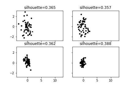 Another figure-of-merit is the silhouette coefficient, which measures how compact and separated the individual clusters are. To compute the silhouette coefficient, we need to compute the mean intra-cluster distance for each sample ($a_i$) and the mean distance to the next nearest cluster ($b_i$). Then, the silhouette coefficient for the $i^{th}$ sample is