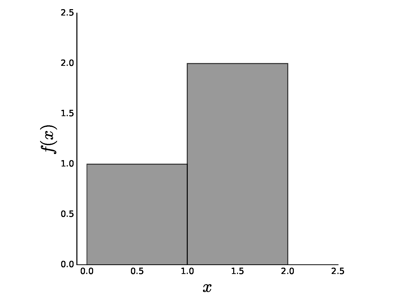 $$ f(x) = \begin{cases} 1 & \mbox{if } 0 < x \leq 1 \\\ 2 & \mbox{if } 1 < x \leq 2 \\\ 0 & \mbox{otherwise } \end{cases} $$as shown in Figure. In calculus, you learned Riemann integration, which you can apply here as