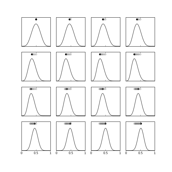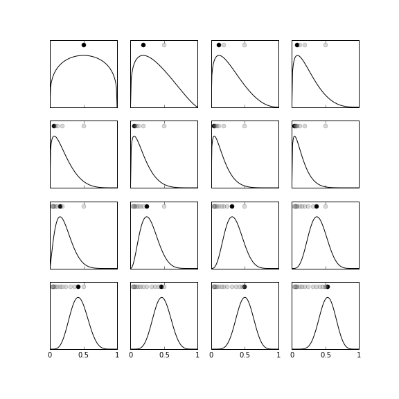 $$ \mathbb{P}(\theta|x_{k+1}) = \frac{\mathbb{P}(x_{k+1}|\theta)\mathbb{P}(\theta|x_k)}{\mathbb{P}(x_{k+1})} $$This is a very different strategy because we are using every data sample $x_k$ as a parameter for the posterior distribution instead of lumping all the samples together in a summation (this is where we got the $k$ term in the prior case). This case is much harder to analyze because now every incremental posterior distribution is itself a random function because of the injection of the $x$ random variable. On the other hand, this is more in line with more general Bayesian methods because it is clear that the output of this estimation process is a posterior distribution function, not just a single parameter estimate. Figure illustrates this method. The graph in the top row, far left shows the prior probability ($\beta(6,6)$) and the dot on the top shows the most recent MAP-estimate for $\theta$. Thus, before we obtain any data, the peak of the prior probability is the estimate. The next graph to right shows the effect of $x_0=0$ on the incremental prior probability. Note that the estimate has barely moved to the left. This is because the influence of the data has not caused the prior probability to drift away from the original $\beta(6,6)$-distribution. The first two rows of the figure all have $x_k=0$ just to illustrate how far left the original prior probability can be moved by those data. The dots on the tops of the sub-graphs show how the MAP estimate changes frame-by-frame as more data is incorporated. The remaining graphs, proceeding top-down, left-to-right show the incremental change in the prior probability for $x_k=1$. Again, this shows how far to the right the estimate can be pulled from where it started. For this example, there are an equal number of $x_k=0$ and $x_k=1$ data, which corresponds to $\theta=1/2$.